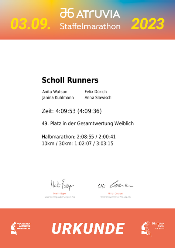 Am 03.09.2023 traten bei bestem (Staffel-)Marathonwetter wieder mal zwei Schulstaffeln unseres Scholl-Gymnasiums an. Die Läufer*innen trugen geschlossen unser traditionelles Courage-Schülerstiftungs-Laufshirt. Beide Staffeln kamen sehr gut voran und die erste Staffel kam in einer Zeit von 3:21:56 ins Ziel und schlugen / pulverisierten damit den seit 2016 bestehenden internen Rekord von 3:22. Auch die zweite Staffel kam nach beachtlichen 4:09:53 glücklich ins Ziel.