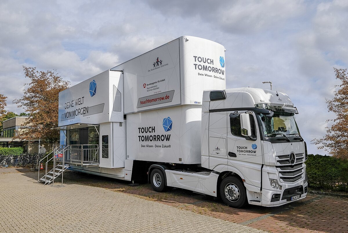 Die Hans-Riegel-Stiftung bringt mit ihrem TouchTomorrow-Truck eine innovative Interaktions- und Informationswelt direkt auf den Schulhof. Ziel ist es, Schülerinnen und Schüler nicht nur für die MINT-Fächer (Mathematik, Informatik, Naturwissenschaften und Technik) zu begeistern, sondern auch konkrete Ausbildungs- und Studienperspektiven aufzuzeigen. Die zentralen Fragen, die in den beiden Etagen des Trucks behandelt werden, lauten: „Wie lebe ich morgen?“ und „Wie arbeite ich morgen?“ (Weitere Informationen unter: https://www.touchtomorrow-truck.de/ )