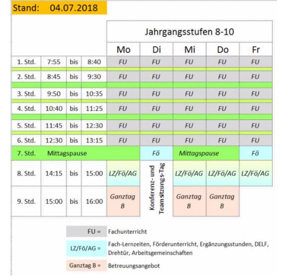 Die Schüler*innen haben im flexiblen Ganztag täglich sechs Stunden Unterricht im Vormittagsbereich. Nach der Mittagspause können sie im Nachmittagsbereich (ab der 8. Stunde) zwischen verschiedenen Angeboten (Lernzeiten, Förderkurse, AG- Angebote, besondere Enrichmentangebote) auswählen und sich so individuell ihren Nachmittagsstundenplan gestalten: So gibt es zum Beispiel die Möglichkeit, sich in der Stiftung-Courage zu engagieren, als Schulsanitäter*in ausgebildet zu werden, an einer Informatik-AG (MIRA) teilzunehmen, das Cambridge Certificate for Advanced English zu erwerben, an einer Sport-AG teilzunehmen, in einer Lernzeit die wöchentlichen Aufgaben zu erledigen oder in einem Förderkurs die Leistungen in einem Fach zu verbessern.