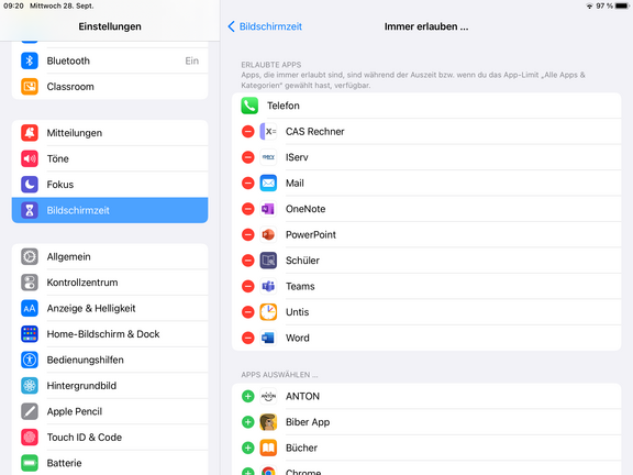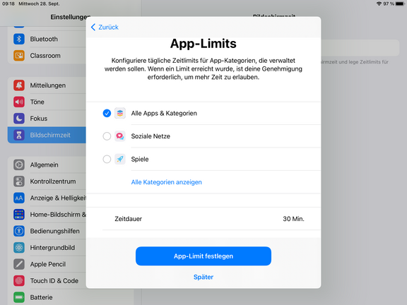 Hier empfehlen wir (zur Zeit): Alle Apps und eine Zeitdauer von 30 Minuten. Dies kann auch (später noch) angepasst werden. Somit wird das iPad bezüglich der Nutzung eingeschränkt - schulische Apps können aber weiterhin verwendet werden.