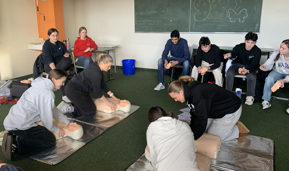 Die Ausbildung erfolgt in der Regel zu Beginn des zweiten Halbjahres durch die Johanniter in Münster. Den Schulsanitätern wird sowohl theoretisch als auch praktisch durch Fallbeispiele beigebracht, sich in verschiedenen Notfallsituationen richtig zu verhalten. Das dort erworbene Zertifikat ist zugleich Erste-Hilfe-Nachweis für die Führerscheinprüfung. Im Schulsanitätsdienst geht es auch darum gesellschaftliche Verantwortung zu übernehmen, Zivilcourage zu zeigen und schulisches Leben mitzugestalten. Für ihr Engagement im Schulsanitätsdienst sind daher drei Schülerinnen und Schüler mit dem Willi-Graf-Preis 2022 ausgezeichnet worden.