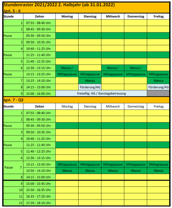 Neue Unterrichtszeiten mit Beginn 2. Halbjahr 2021/22